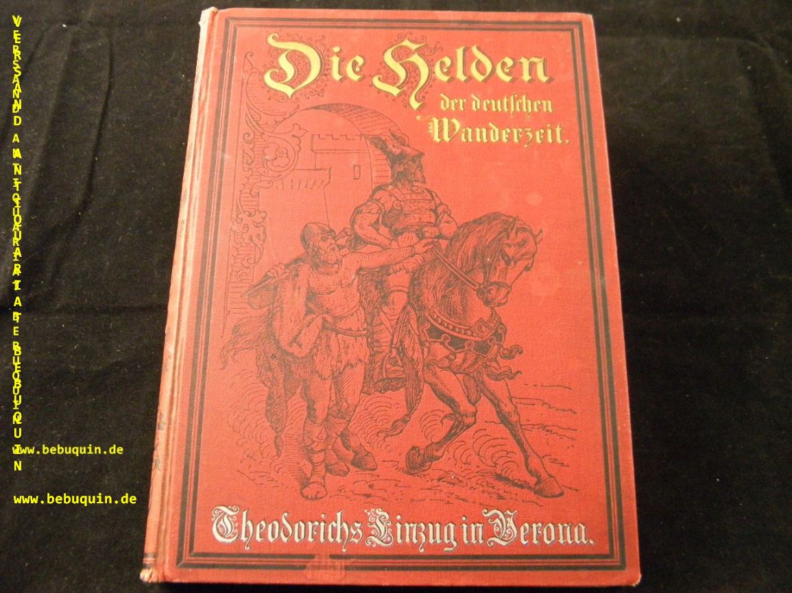 PICHLER, Luise: Die Helden der deutschen Wanderzeit. Erzählungen aus der Geschichte der Völkerwanderung für die Jugend. Esslingen (Schreiber), (1884). Gr. 8°. 238 S., 5 Bl. mit 5 feinen Farbendruckbildern von Oskar Schulz. ill. OLn. Rücken leicht angeplatzt, beide fliegende Vorsätze entfernt, sonst gutes Ex. EA. Klotz 5449/52.