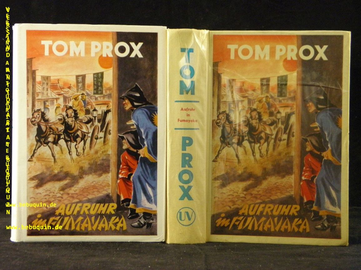 TOM PROX.– DAY, Derrick: Aufruhr in Fumayaka. Sinzig (Uta), 1954. 254 (2) S. farb. ill. OPb. mit OUmschl. gestempeltes Leihbuch, Cellophan beschädigt. = Tom Prox abenteuerliche Erlebnisse, Bd. 67. 1. Aufl. dieser Ausgabe.