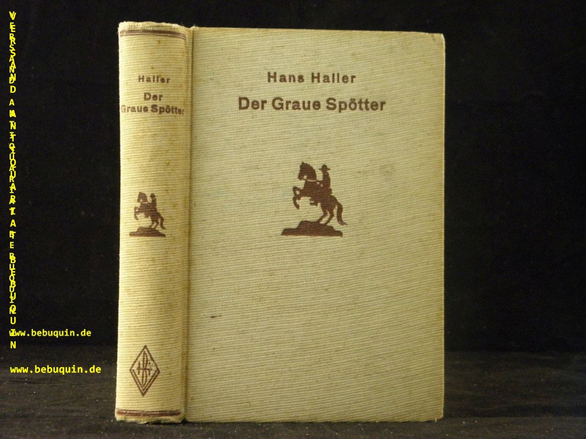 HALLER, Hans: Der graue Spötter. Bremen (Burmester), (1938). 256 S. ill. OLn. kaum bestaubt. = Burmester’s Abenteuer – Serie. EA. Schegk / Wimmer S6.