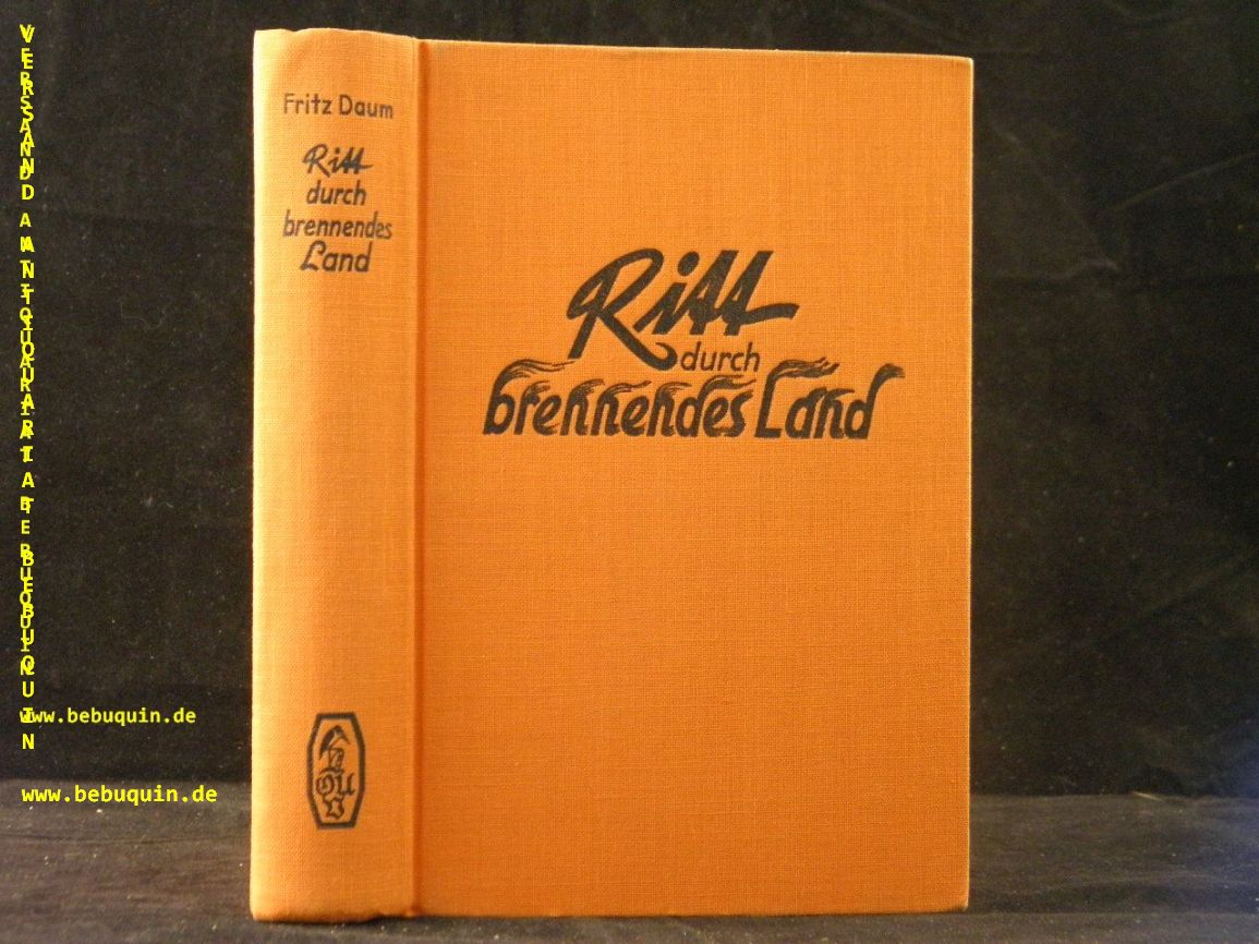 DAUM, Fritz: Ritt durch brennendes Land. Abenteuerroman. Berlin (Uhlmann), 1937. 272 S. OLn. gestempeltes Leihbuch, sonst sehr gutes Ex. = Uhlmann – Bücher. EA.