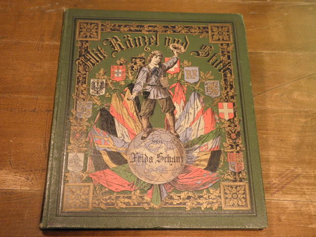 SCHANZ, Frida: Mit Ränzel und Stab. Eine Pensions- und Reise-Geschichte. Leipzig (Abel), (1887). Gr. 8°. 124 S. + 12 große Buntbilder jeweils mit Landkarte und landestypische Trachten und Ansichten aus Europa. farb. ill. OLn. Rücken leicht angeplatzt. EA (Klotz 6208.125/ Wegehaupt II, 2906).