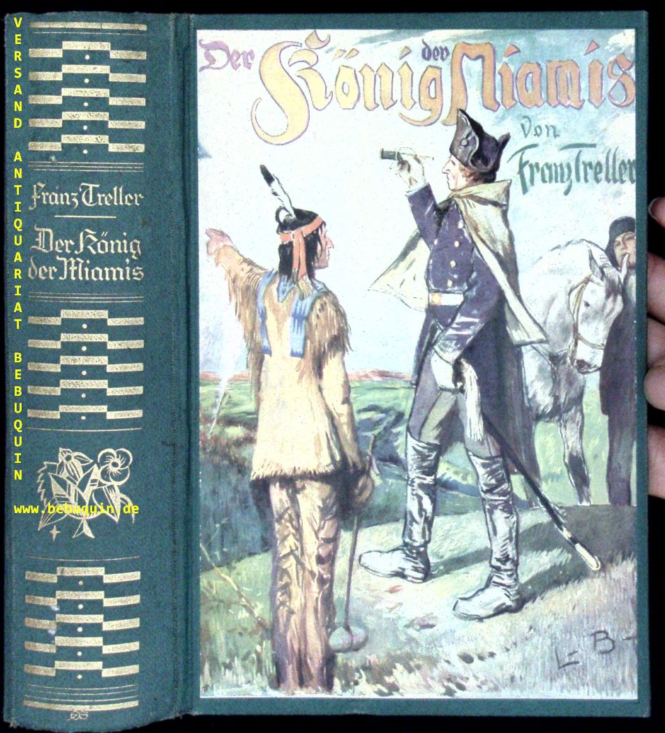 TRELLER, Franz: Der König der Miamis. 15. Aufl. Stuttgart (Gustav Weise), (1929). 431 (1) S. mit Bildern von Leo Bauer. OLn mit mont. Farbbild. WaV, vorderes Gelenk leicht gelockert, insgesamt schönes Ex. 1. Aufl. dieser illustrierten Ausgabe. Klotz 7484/24.