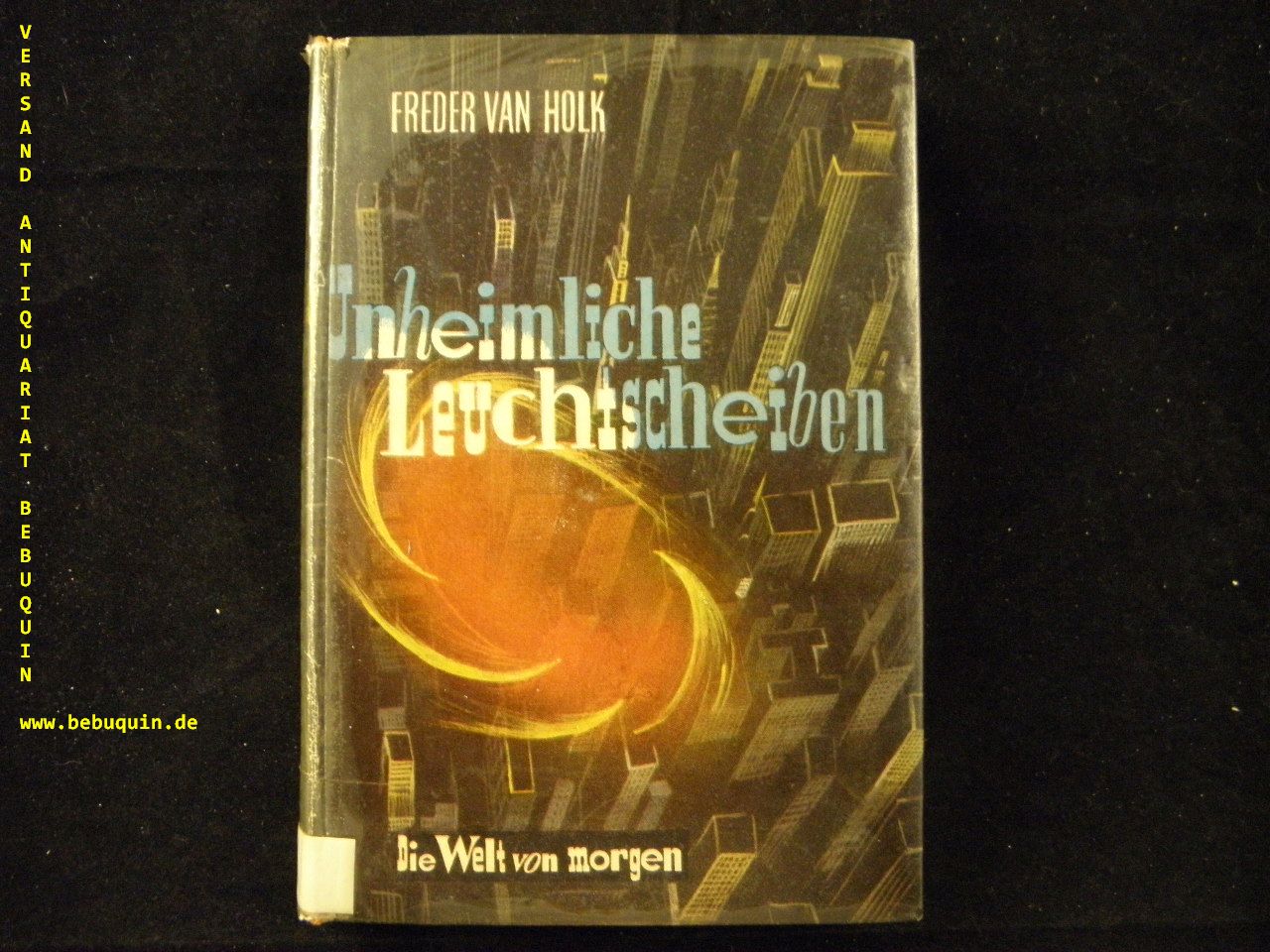HOLK, Freder van: Unheimliche Leuchtscheiben. Berlin (Weiss), ca 1955. 238 (2) S. OLn mit fest mont. OUmschl. gestempeltes Leihbuch. seltene EA.