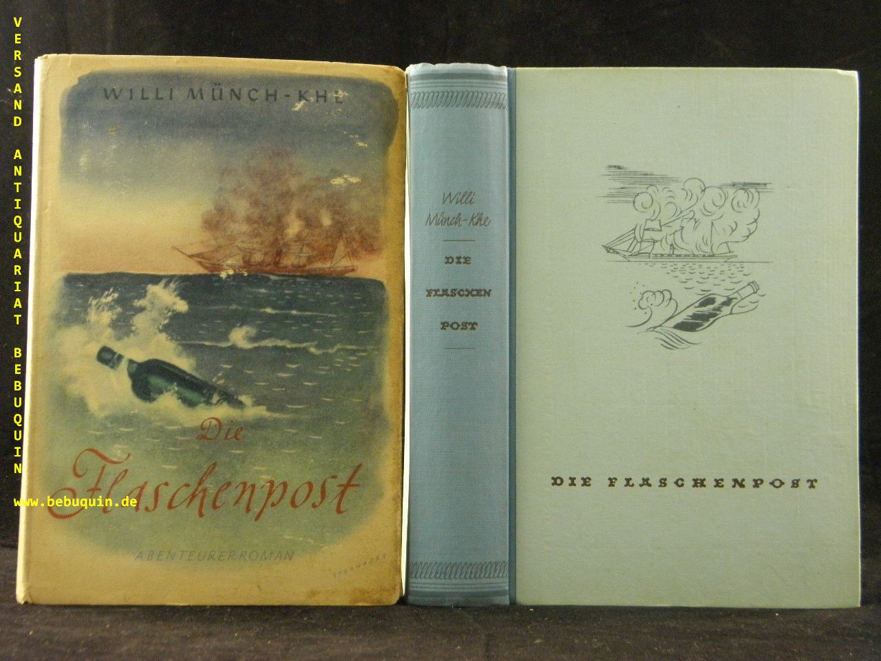 MÜNCH-KHE, Willi: Die Flaschenpost. Abenteuerroman. 6.– 10. Tsd. Berlin (Scherl), 1940. 309 (2) S. ill. OHLn mit OUmschl. Umschlagrücken etwas gebräunt, WaV, insgesamt gutes Ex.