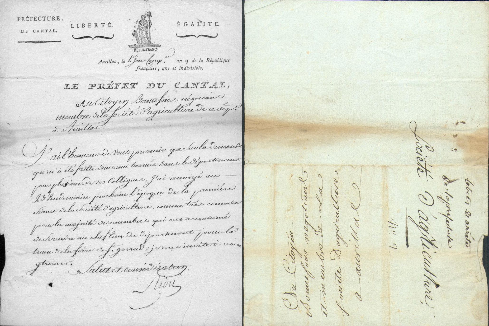 RIOU DE KERSALAÜN, Francois Marie Joseph (1765 – 1811), Politiker und Verwaltungsbeamter: Brief mit Unterschrift an den Händler Bonnefour, dass die Sitzung der landwirtschaftlichen Vereinigung verschoben wird. Er teilt ihm mit, dass er die nächste Sitzung der besagten Gesellschaft auf den 23. Vendemaire (15. Oktober) verschoben hätte, da zu dieser die Mehrheit der Mitglieder ohnehin aufgrund des Markts von St. Geraud in Aurillac sein wird. Aurillac, 1800. 23 x 17 cm. 2 S. auf Doppelbogen Hadernbütten mit gestochener Kopfvignette und Kopfdruck der Prefecture du Cantal. etwas gebräunt, mittig gefaltet und dort etwas eingerissen. Verfasser war Baron de l’Empire. Deputierter beim Rat der 500, Präsident der Nationalversammlung 1797, erster Präfekt des Departements des CANTAL 1800-1810.