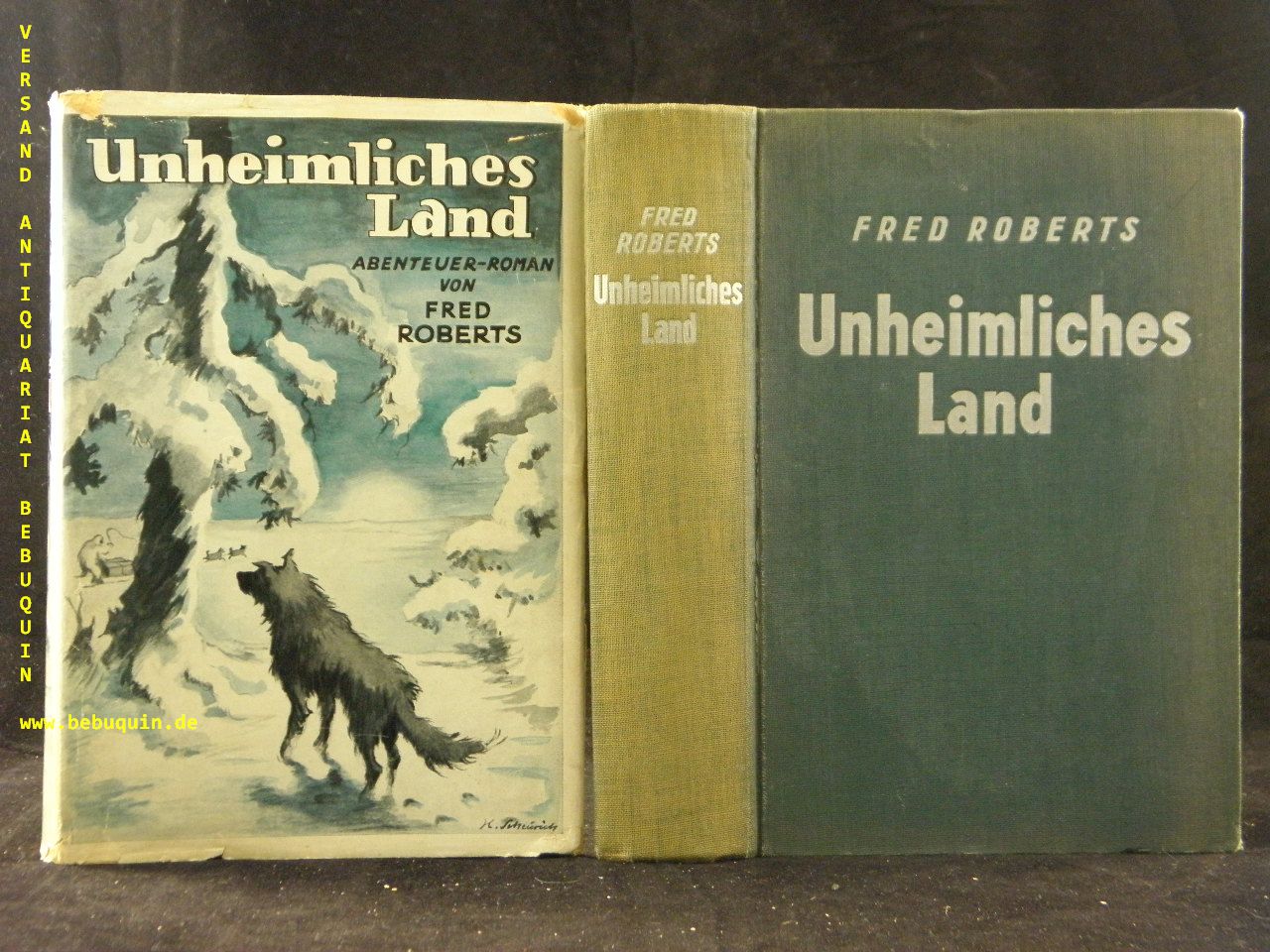 ROBERTS, Fred: Unheimliches Land. Abenteuerroman. Dresden (Heyne), 1935. 334 S. OLn mit Silberprägung und OUmschl. Umschlagkanten fast komplett hinterlegt, Rücken geblichen, sonst gutes Ex. = Fred Roberts Abenteuer-Romane. EA.