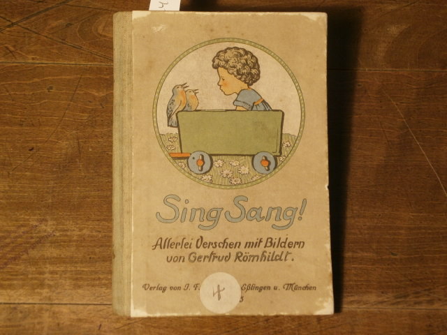 RÖMHILDT, Gertrud: Sing Sang. Allerlei Verschen mit Bildern. Esslingen (Schreiber), (1913). kl. 8°. 32 S., 2 Bl. mit 33 farb. Bildern und zahlr. Vignetten der Verfasserin. Farb. ill. OHLn. Kanten berieben, kleines Etikett auf Vorderdeckel, innen nur vereinzelt fingerspurig. EA der ersten Veröffentlichung. Slg. Hobrecker Braunschweig 7272, Ries 824,2.