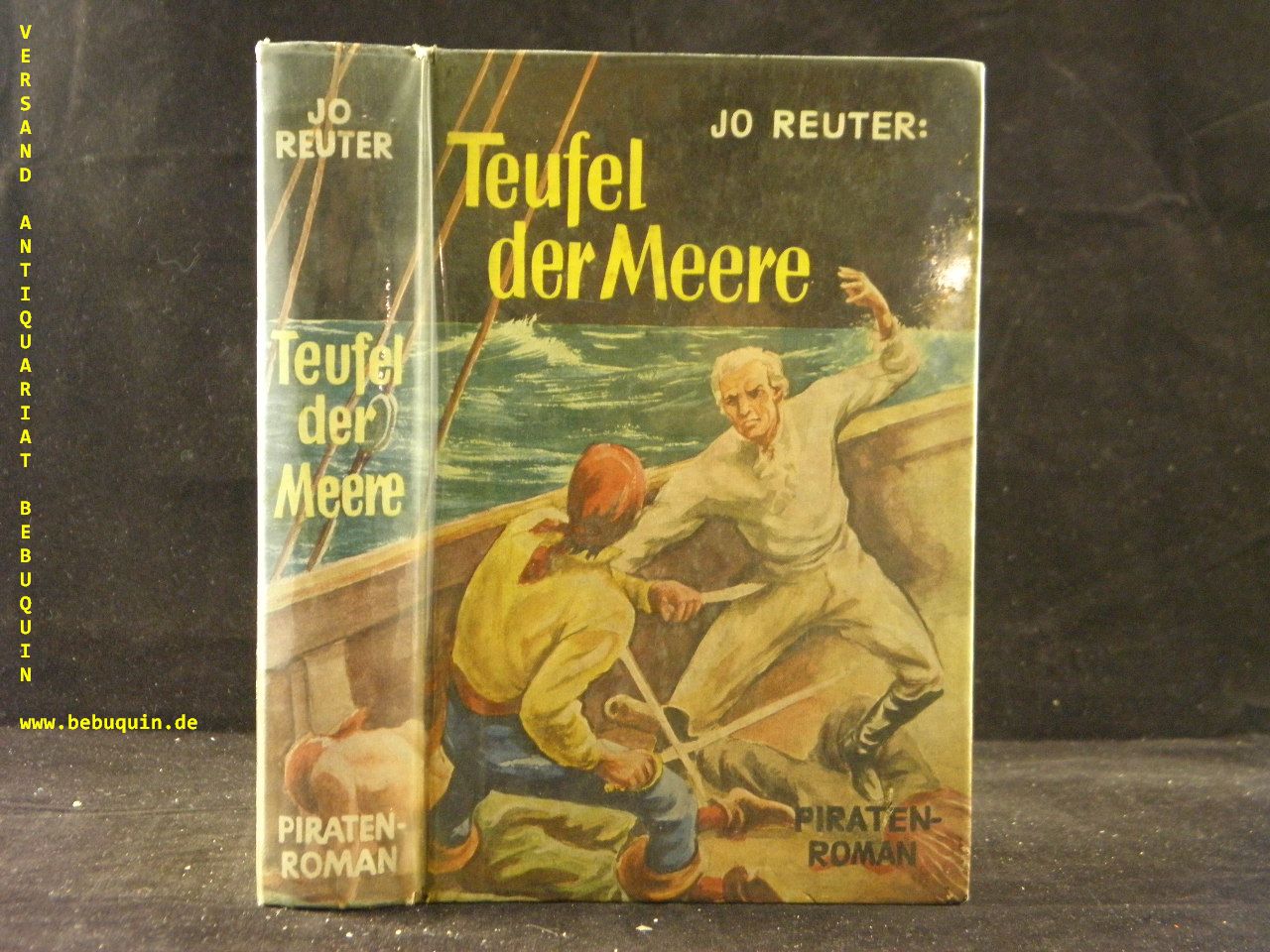 REUTER, Jo: Teufel der Meere. Piratenroman. Kaiserslautern (Skorpion), 1952. 256 S. farb. ill. OPb. mehrfach gestempeltes Leihbuch. EA. Indiziertes Leihbuch *1957!