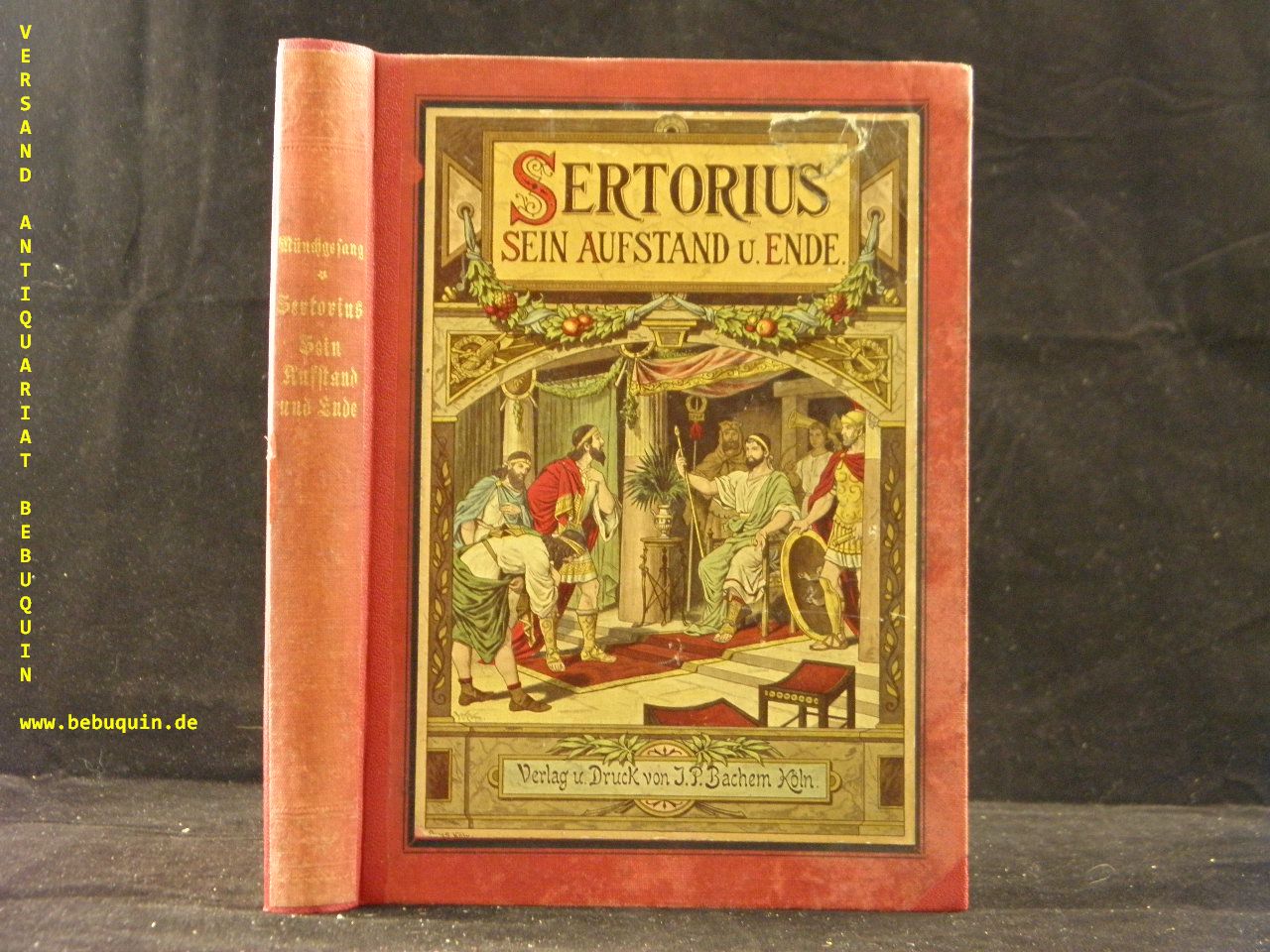 MÜNCHGESANG, Robert: Sertorius, sein Aufstand und Ende. Eine Erzählung aus altrömischer Zeit. Köln (Bachem), (1901). 4 Bl., 176 S. mit 4 Farbendruckbildern von Wilhelm Rohm. OLn mit mont. Farbbild. alter Rücken neu aufgezogen, Titelseite mit Radierspur, Vorsätze erneuert. = Bachems neue illustrierte Jugendschriften, Bd. 18. EA. Klotz 4911/30.