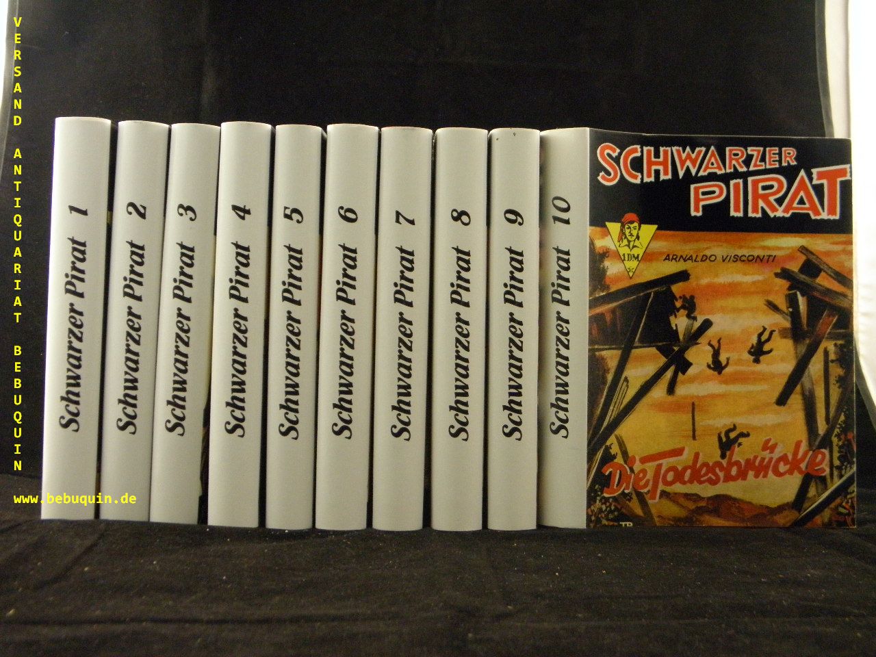 SCHWARZER PIRAT.– VISCONTI, Arnaldo: Schwarzer Pirat. Heft 1 – 60 (alles erschienene) in 10 Bänden. Nachdruck der Ausgabe: Hamburg (Petersen), 1950 – 55. 60 x 50 – 60 S. mit zahlr. Abb. und den farb. OUmschlägen mit eingebunden. rote OLn mit OUmschl. neuwertig. seltener Reprint des berühmten Heftromans in opulenter Gestaltung.