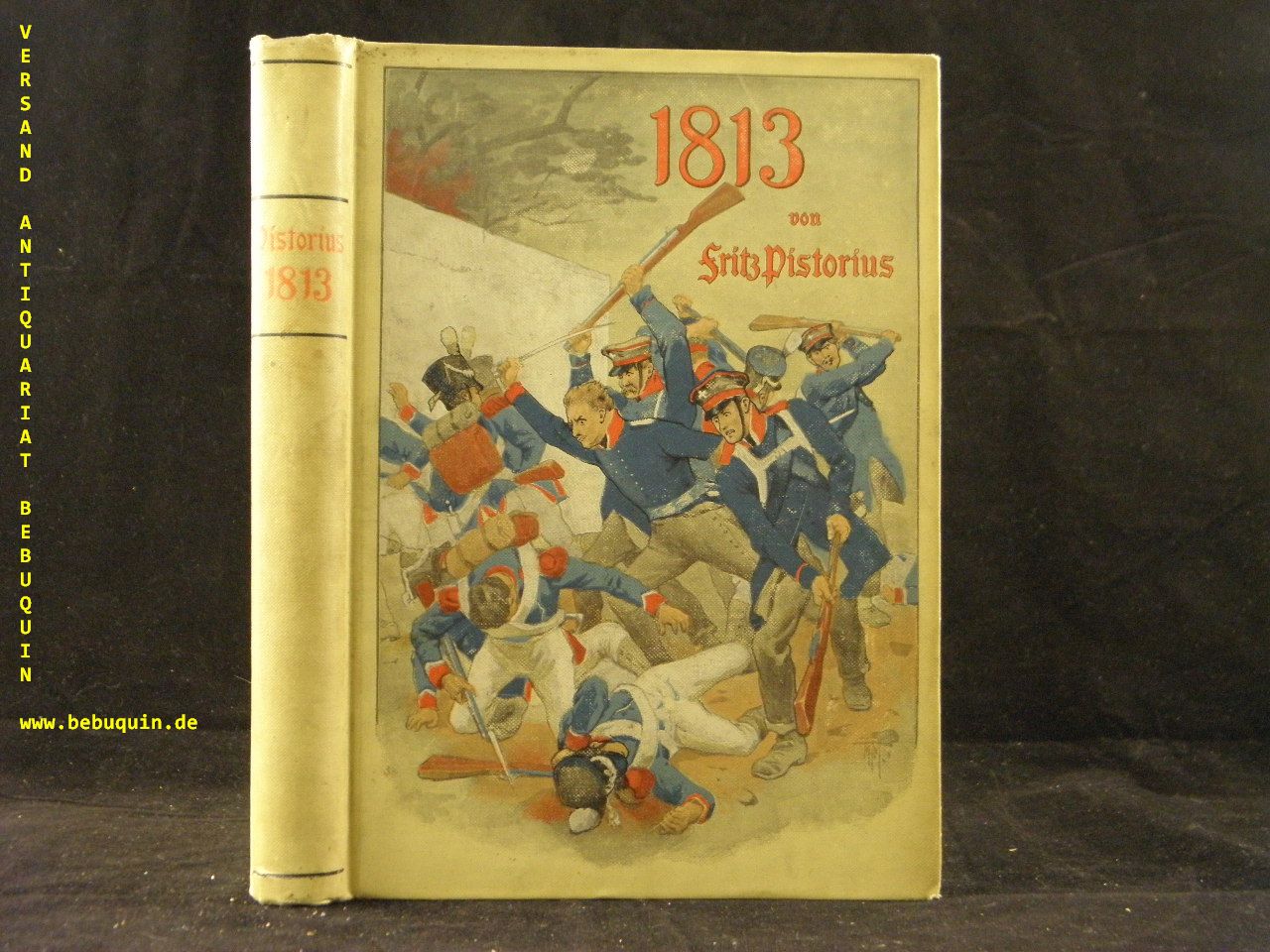 PISTORIUS, Fritz: Das Volk steht auf! 1813. 3. Aufl. Berlin (Trowitzsch), (1912). Gr. 8°. 296 (8) S. mit 1 Buntbild und 10 Karten. farb. ill. OLn. NaV, Schnitt etwas angeschmutzt. = Mit Gott für König und Vaterland. Kriegserlebnisse eines preußischen Jungen, Bd. III. EA Klotz 5272/17.
