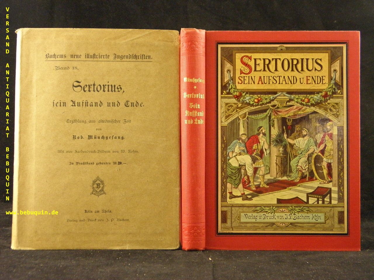 MÜNCHGESANG, Robert: Sertorius, sein Aufstand und Ende. Eine Erzählung aus altrömischer Zeit. Köln (Bachem), (1901). 4 Bl., 176 S. mit 4 Farbendruckbildern von Wilhelm Rohm. OLn mit mont. Farbbild und OUmschl. wie neu. = Bachems neue illustrierte Jugendschriften, Bd. 18. EA. Klotz 4911/30.
