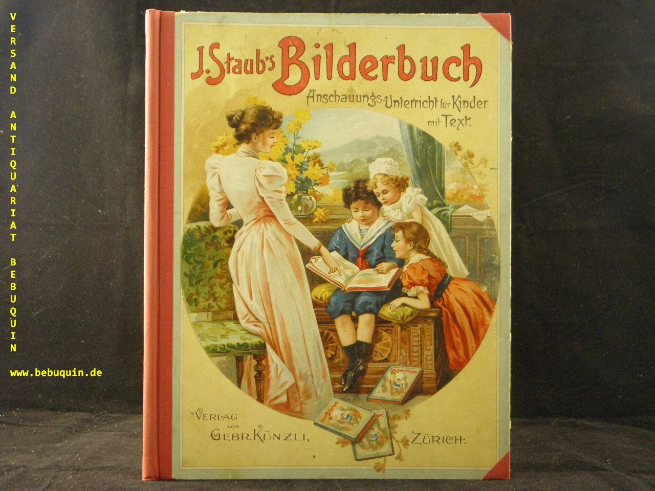 STAUB, Johannes: J. Staubs Bilderbuch. 3. Heft. Anschauungsunterricht für Kinder. Ein Buch für Haus und Schule. Zürich (Künzli), 1905. Gr. 4°. 12 farb. lithogr. Doppeltaf. u. 8 S. Text. farb. ill. OHLn. wenige kleine hinterlegte Einrisse, Gelenke stabilisiert. Tafel 25 – 36. Inhalt der Tafelbilder: Singvögel, Klettervögel, Reptilien, Fische, Wald, Lufterscheinungen, Giftpflanzen, Jahreszeiten, Fremde Früchte, Moralbilder..