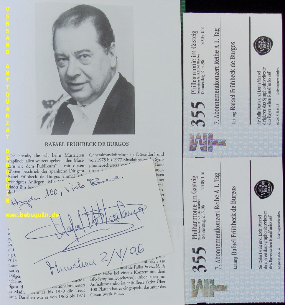 FRÜHBECK DE BURGOS, Rafael (Dirigent): eigenhändig signierte und datierte Autogrammkarte. Mit dem Chor und Symphonieprchester des Bayrischen Rundfunks. München (Philharmonie), 2.5.1996. Gr. 8°. Karteikarten in Original Programmheft. ill. OKart. mit 2 Eintrittskarten inliegend. tadellos. Rafael Frühbeck (* 15. September 1933 in Burgos; † 11. Juni 2014 in Pamplona), bekannt unter seinem Künstlernamen Rafael Frühbeck de Burgos, war ein spanischer Dirigent deutscher Herkunft. (Wikipedia)