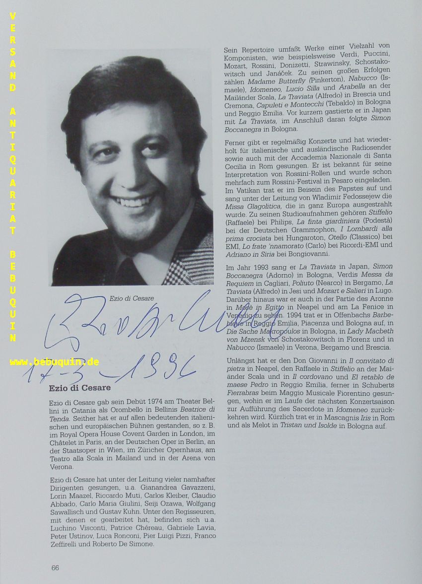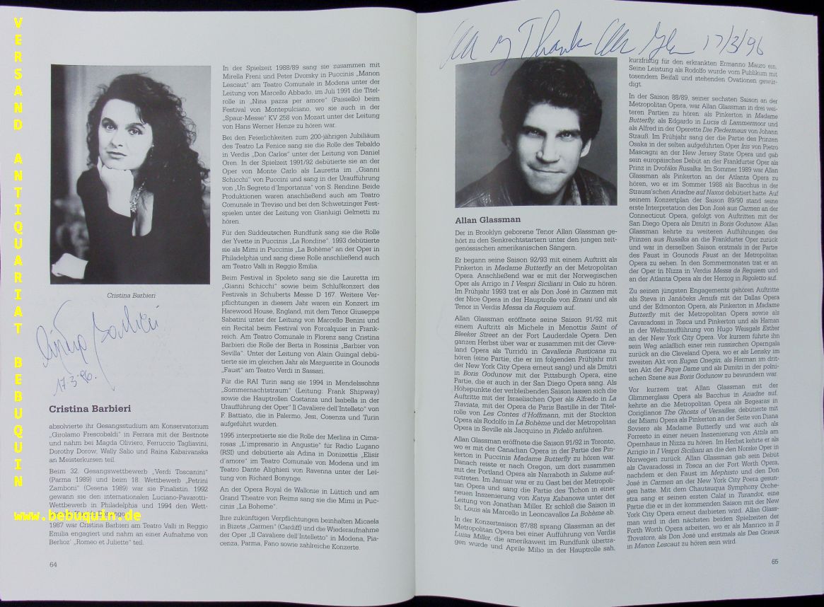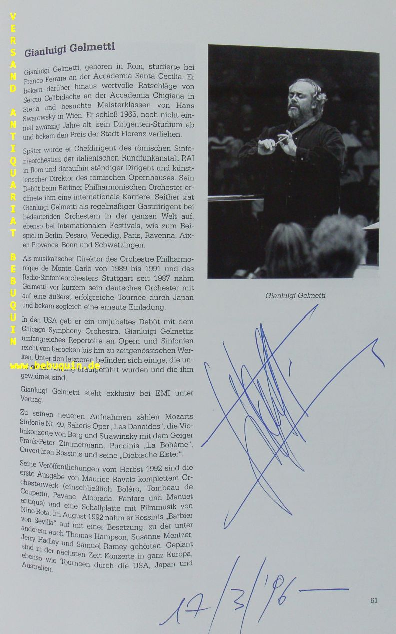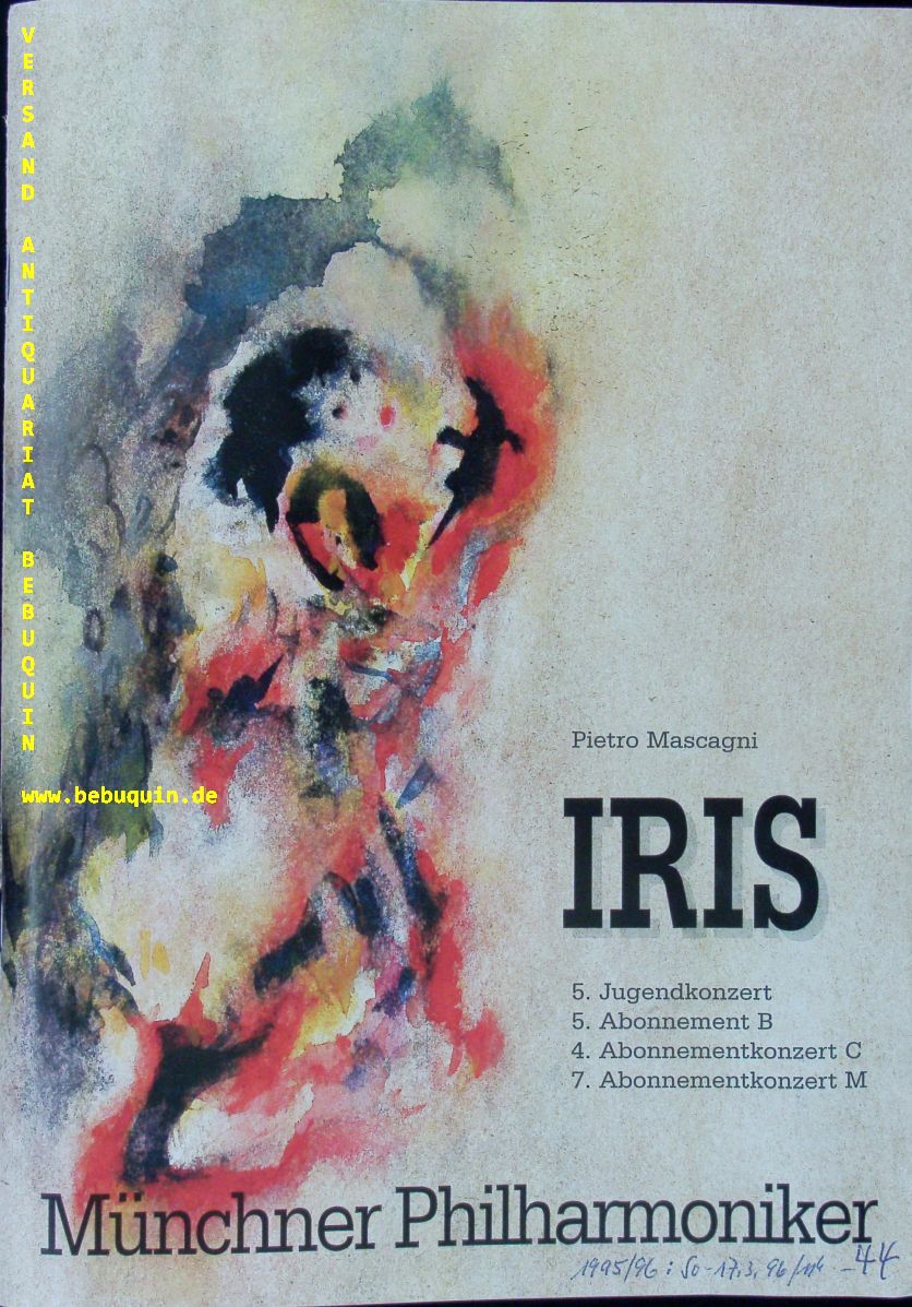 GELMETTI, Gianluigi (Dirigent) + ROBSON, Richard + MAGOMEDOVA, Elmira + GLASSMANN, Allan + MEONI, Giovanni + BARBIERI, Christina + CESARE, Ezio di: Programmheft der Konzertanten Aufführung von „Iris“ mit den eigenhändigen Signaturen der Solisten an den entsprechenden Fotos. Münchner Philharmoniker. München (Philharmonie), 17.3.1996. 4°. 68 S. mit zahlr. teils ganzseitigen farbigen Abb. farb. ill. OKart. mit 2 inliegenden Eintrittskarten. gutes Ex. Gianluigi Gelmetti (* 11. September 1945 in Rom) ist ein italienischer Dirigent und Komponist.