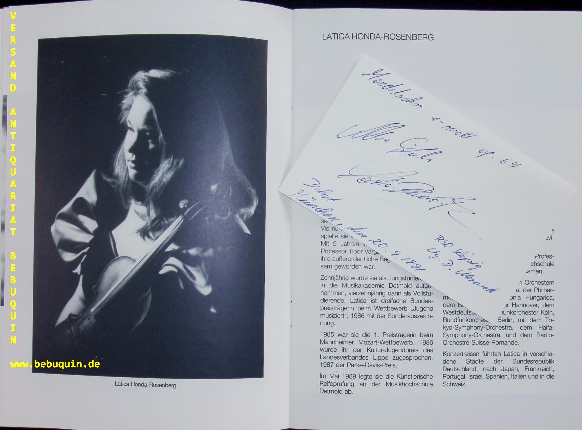 HUNDA-ROSENBERG, Latica (Violinistin) + NAZARETH, Daniel (Dirigent): 2 eigenhändig signierte und datierte Autogrammkarte. Mit dem Rundfunk-Sinfonieorchester Leipzig. München (Philharmonie), 20.9.1991. 8 x 12,5 cm. 2 Karteikarten in Programmheft. 16 S. mit Abb. OKart. tadellos = Münchner Konzertdirektion Hörtnagel. Daniel Nazareth (* 8. Juni 1948 in Bombay; † 19. Juni 2014 in Wien) war ein österreichischer Dirigent und Komponist indischer Herkunft. Von 1992 bis 1996 war er Chefdirigent des MDR Sinfonieorchesters in Leipzig. (Wikipedia)