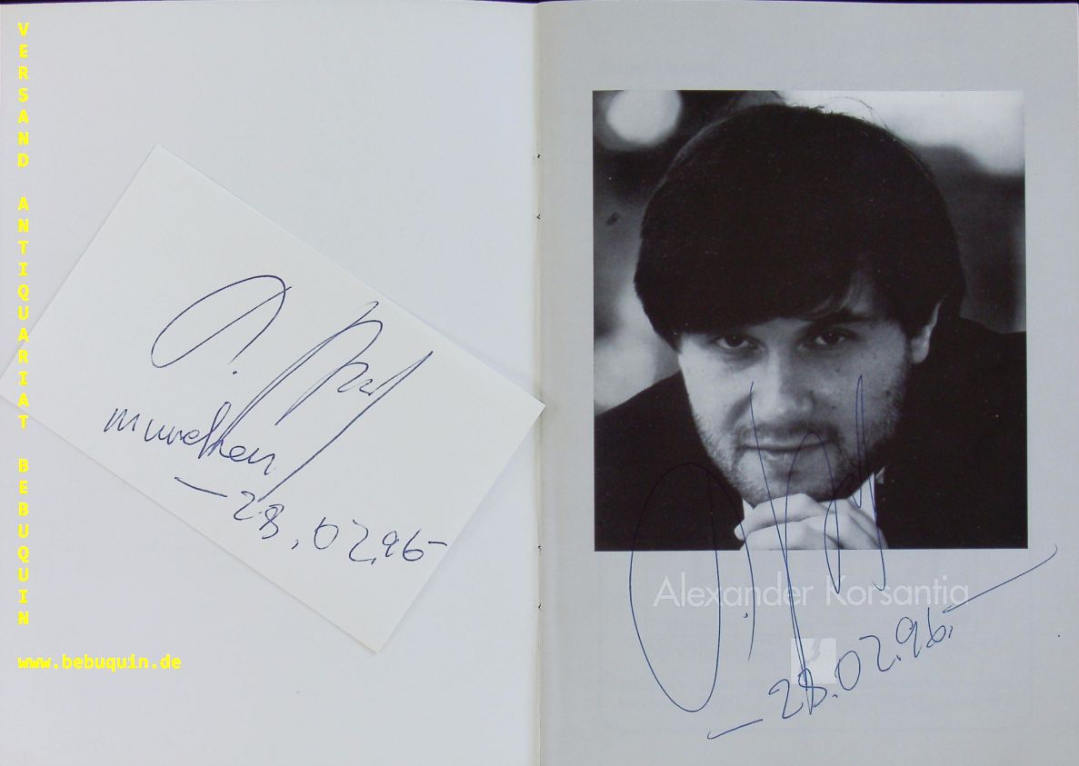 KORSANTIA, Alexander (Pianist): Programmheft mit der eigenhändigen datierten Signatur am Portraitfoto. München (Herkulessaal), 28.2. 1996. 12 S. mit Abb. OKart. dabei eine eigenhändig signierte und datierte Karteikarte. tadellos = Münchner Konzertdirektion Hörtnagel. Alexander Korsantia (* 18.4.1965) ist ein georgischer internationaler preisgekrönter Pianist. Alexander wanderte 1992 nach Kanada aus und ließ sich in Vancouver, British Columbia, nieder. Nachdem er einige Jahre in Vancouver gelebt hat, lebt er derzeit in Boston, Massachusetts. (Wikipedia)
