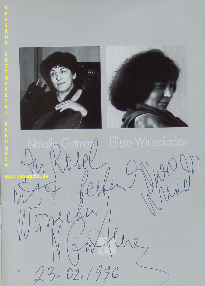 GUTMANN, Natalia (Cellistin) + WIRSSALADZE, Elisso (Pianistin): Programmheft mit den eigenhändigen Signaturen und persönlicher Widmung der Musikerinnen am Titelportrait München (Herkulessaal), 23.2.1996. 12 S. mit Abb. OKart. tadellos = Münchner Konzertdirektion Hörtnagel.