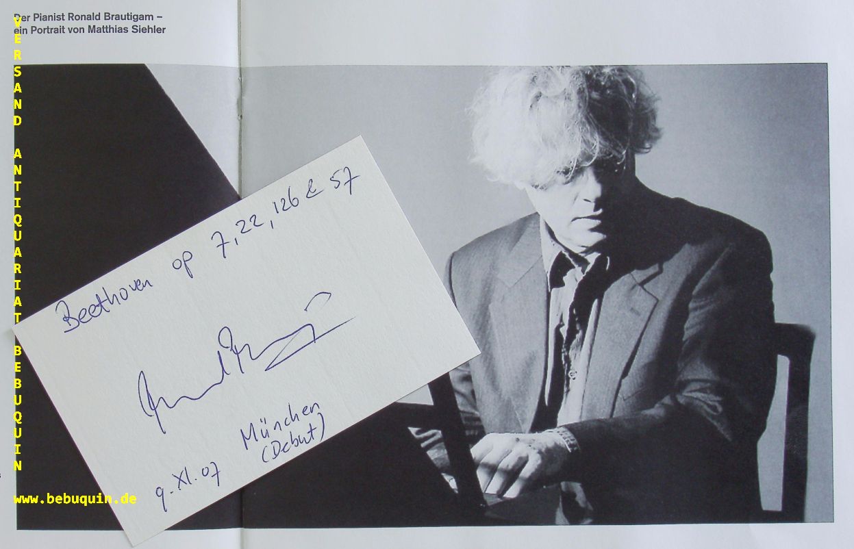 BRAUTIGAM, Ronald (Pianist): eigenhändig signierte und datierte Autogrammkarten. München (Herkulessaal), 9.11.2007. 8 x 12,5 cm. Karteikarte in Programmheft. 8 S. mit zahlr. Abb. OKart. tadellos = Winderstein Konzerte. Ronald Brautigam (* 1. Oktober 1954 in Amsterdam) ist ein niederländischer Pianist. Er studierte in Amsterdam, London und in den USA bei Rudolf Serkin. 1984 erhielt er den „Nederlandse Muziekprijs“, die höchste musikalische Auszeichnung des Landes. Seither musiziert Brautigam mit internationalen Orchestern. Neben seinen Auftritten mit modernen Instrumenten gilt Brautigam als einer der Exponenten des Hammerklaviers. (Wikipedia)