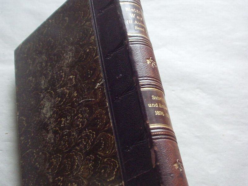 NIETZSCHE, Friedrich: Nachgelassene Werke. Aus den Jahren 1872/73 – 1875/76. 2. völlig neu gestaltete Aufl. 1. und 2. Tsd. Leipzig (Naumann), 1903. Gr. 8°. VI, 528 S. OHLdr mit goldgeprägtem Rücken. oberes Kap sauber restauriert. = Werke, 2. Abt. Bd. X.