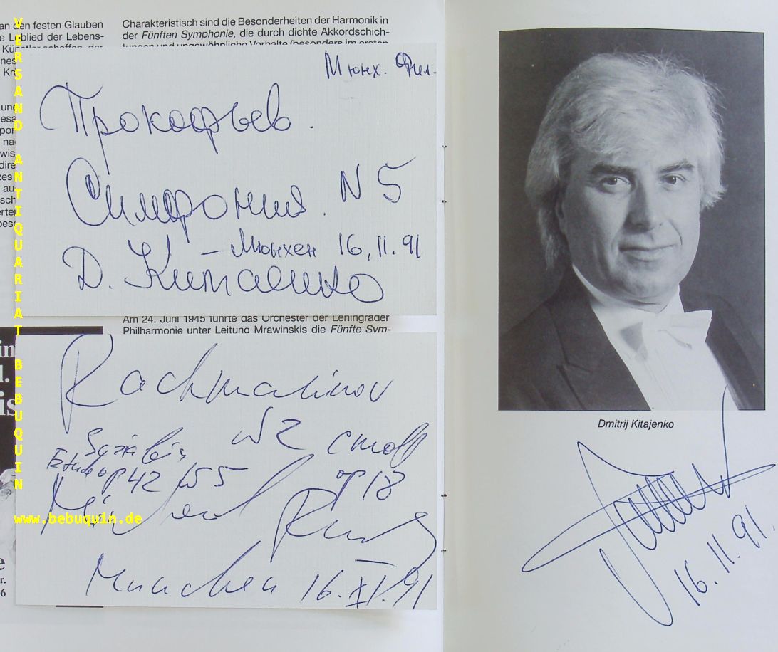 KITAJENKO, Dmitrij (Dirigent) + RUDY, Mikhail (Pianist): 2 eigenhändig signierte und datierte Autogrammkarten. München (Philharmonie), 13.11.1991. 8 x 12,5 cm. 2 Karteikarten in Programmheft. Dort auch zusätlich eigenhändig neben dem Portraitbild von Dmitrij Kitajenko signiert und datiert. 12 S. mit zahlr. Abb. OKart. anbei 2 Eintrittskarten tadellos = Münchner Philharmonie Dmitri Georgijewitsch Kitajenko (* 18. August 1940 in Leningrad (heute Sankt Petersburg), Sowjetunion) ist ein russischer Dirigent.