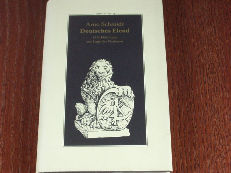 SCHMIDT, Arno: Deutsches Elend. 13 Erklärugen zur Lage der Nation. Zürich (Haffmann), 1984. kl. 8°. 119 S. OPb mit OUmschl. EA (d.i. 1.– 6. Tsd.)