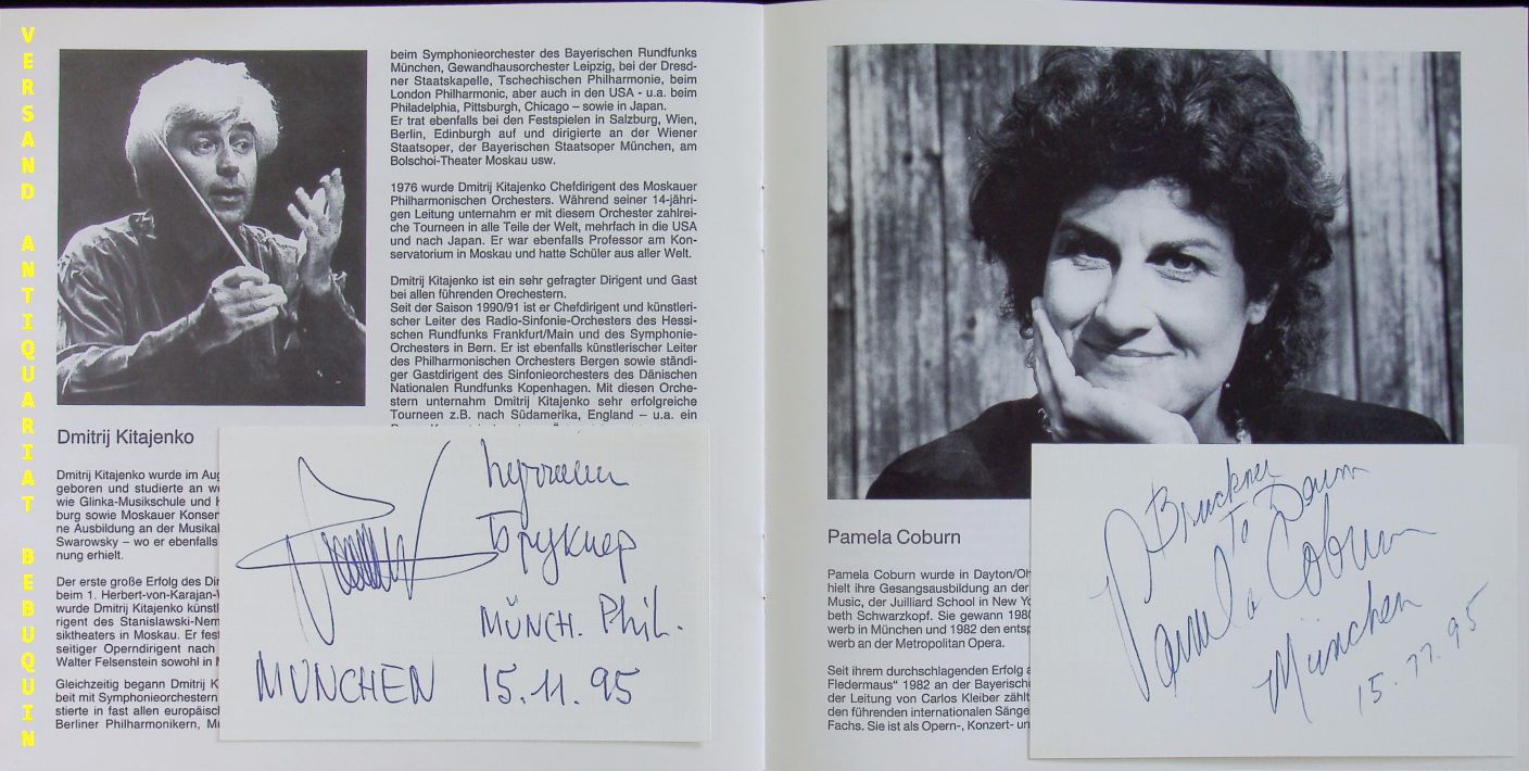KITAJENKO, Dmitrij (Dirigent) + COBURN, Pamela (Sopran) + BORCHERS, Christl (Alt) + STRAKA, Peter (Bass): 5 eigenhändig signierte und datierte Autogrammkarten. München (Philharmonie), 15.11.1995. 8 x 12,5 cm. 5 Karteikarten in Programmheft. 20 S. mit zahlr. Abb. OKart. anbei 1 Eintrittskarte tadellos = Münchner Philharmonie Dmitri Georgijewitsch Kitajenko (* 18. August 1940 in Leningrad (heute Sankt Petersburg), Sowjetunion) ist ein russischer Dirigent.