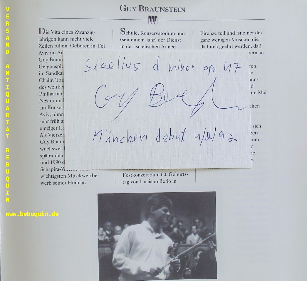 FEDOSSEJEW, Wladimir (Dirigent) + BRAUNSTEIN, Guy (Violonist): 2 eigenhändig signierte und datierte Autogrammkarten. Mit Moskauer Radio Sinfonieorchester. München (Philharmonie), 4.2.1992. 8 x 12,5 cm. 2 Karteikarten in Programmheft. 12 S. mit zahlr. Abb. OKart. tadellos = Winderstein Konzerte. Wladimir Iwanowitsch Fedossejew (* 5. August 1932 in Leningrad) ist ein russischer Dirigent. Guy Braunstein (* 27. August 1971 in Tel Aviv, Israel) ist ein israelischer Violinist. Er war von 2000 bis 2013 Erster Konzertmeister der Berliner Philharmoniker. (Wikipedia)