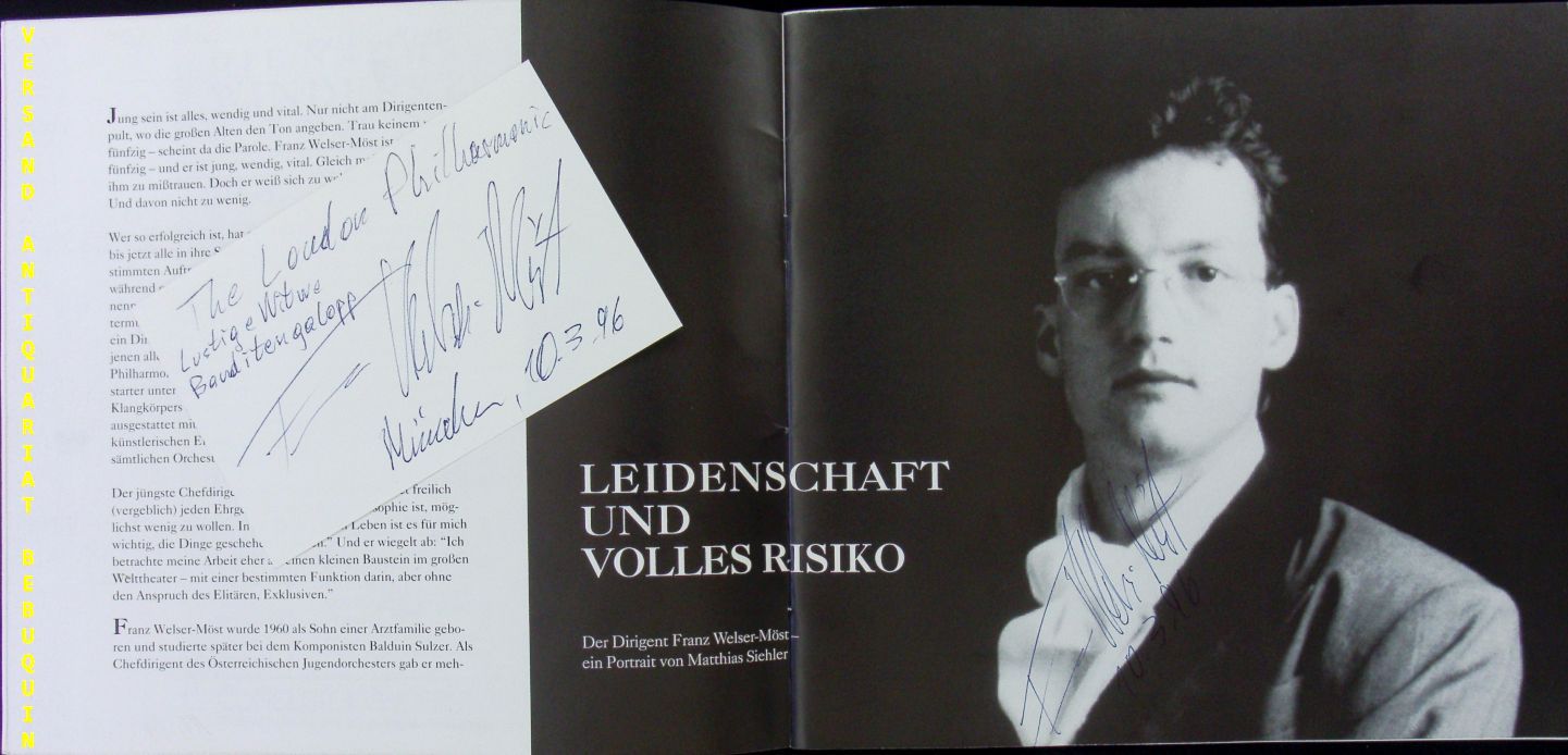 WELSER-MÖST, Franz (Dirigent): eigenhändig signierte und datierte Autogrammkarte. Mit London Philharmonic Orchestra München (Philharmonie), 10.3.1996. 8 x 12,5 cm. Karteikarten in Programmheft. Hierin weitere eigenhändige datierte Signatur auf Portraitbild. 16 S. mit zahlr. Abb. OKart. tadellos = Winderstein Konzerte. Franz Welser-Möst (eigentlich: Franz Leopold Maria Möst, * 16. August 1960 in Linz, Oberösterreich) ist ein österreichischer Dirigent. Er ist seit 2002 Musikdirektor des Cleveland Orchestra. (Wikipedia)
