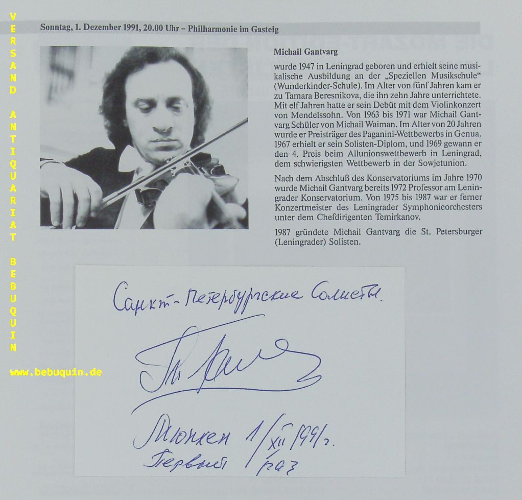 PIAZZINI, Carmen (Pianistin) + GANTVARG, Michail (Dirigent): 2 eigenhändig signierte und datierte Autogrammkarten. Mit den Petersburger Solisten. München (Philharmonie), 1.12.1991. 8 x 12,5 cm. 2 Karteikarte in Programmheft. 2 Eintrittskarten anbei. 12 S. mit zahlr. Abb. OKart. = Münchener Mozart Konzerte. Carmen Piazzini (* 1939 in Argentinien) ist eine argentinische Pianistin. Ihr Repertoire reicht von Klassik über Romantik bis zur Moderne. (Wikipedia)