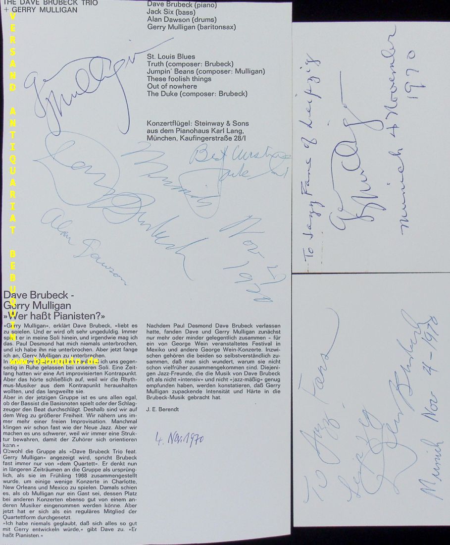 JAZZ.– MULLIGAN, Gery (Baritonsaxophonist) + BRUBECK, Dave (Pianist) + SIX, Jack (Bassist) + DAWSON, Alan (Schlagzeuger): eigenhändig von allen signierter und datierter Programmheftausschnitt. München 4.11.1970. 28 x 14,5 cm. Programmheftausschnitt + 2 Karteikarten, einzeln datiert und signiert von Brubeck bzw. Mulligan. Gerald Joseph „Gerry“ Mulligan (* 6. April 1927 in Queens, New York City; † 20. Januar 1996 in Darien, Connecticut) war ein US-amerikanischer Jazzmusiker (Baritonsaxophon), Arrangeur und Komponist. Mit seinem klarinettenartigen, in Motivketten elegant perlenden und zugleich leicht anmutenden Spiel hat er dem Baritonsaxophon im Modern Jazz zur solistischen Anerkennung verholfen. David Warren „Dave“ Brubeck (* 6. Dezember 1920 in Concord, Kalifornien; † 5. Dezember 2012 in Norwalk, Connecticut) war ein US-amerikanischer Jazzpianist, Komponist und Bandleader. Er leitete mit seinem Quartett eine der langlebigsten und erfolgreichsten Combos des Modern Jazz und eroberte dem Jazz mit der intellektuellen Mittelschicht ein neues Publikum. Jack E. Six (* 26. Juli 1930 in Danville (Illinois)[1]; † Anfang 2015[2]) war ein US-amerikanischer Jazz-Bassist. George Alan Dawson (* 14. Juli 1929 in Marietta, Lancaster County, Pennsylvania; † 23. Februar 1996 in Boston, Massachusetts) war ein US-amerikanischer Jazz-Schlagzeuger. (Wikipedia)