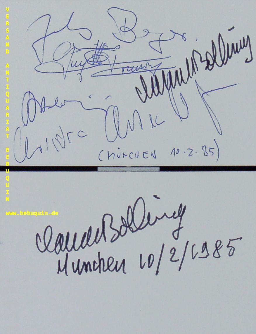 JAZZ.– BOLLING, Claude (Pianist) + TOUVRON, Guy (Trompeter) + ADORJA, Andras (Flötist) + Altenburger, Christian (Violinist) + BERGER, Julius (Cellist): 2 eigenhändig signierte und datierte Autogrammkarten. (1 alle , 1 nur Bolling) München, (Herkulessaal), 10.2.1985. 8 x 12,5 cm. 2 Karteikarten und Begleitblätter. Claude Bolling (* 10. April 1930 in Cannes) ist ein französischer Jazzmusiker (Klavier), Komponist und Musikproduzent. (Wikipedia)