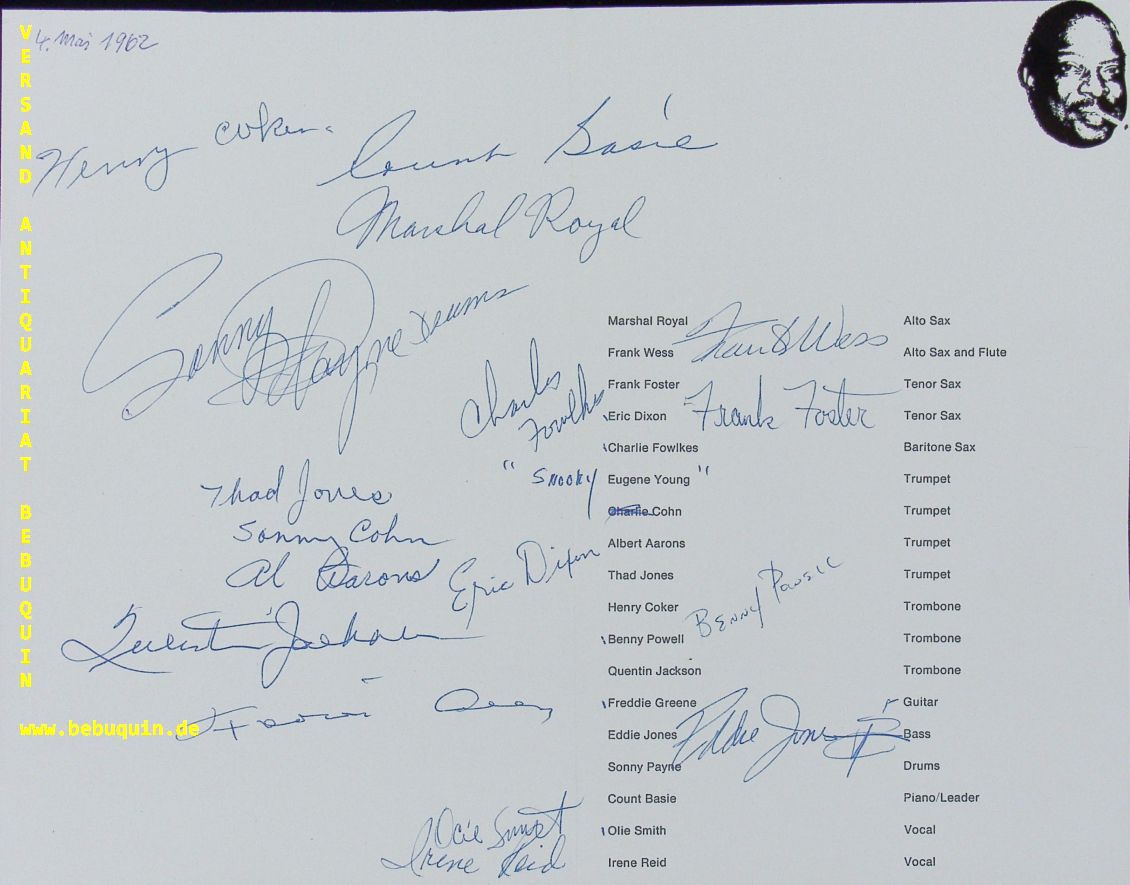 JAZZ.– BASIE, Count (Pianist) + ROYAL, Marshal (Altsaophonist) + WESS, Frank (Altsaxophonist) + FOSTER, Frank (Tenorsaophonist) + DIXON, Eric (Tenorsaxophonist) + FOWLKES, Charlie (Baritonsaxophonist) + YOUNG, Eugene (Trompeter) + COHN, Sonny ( Trompeter) + AARONS, Albert (Trompeter) + JONES, Thad (Trompeter) + COCKER, Henry ( Posaunist) + POWELL, Benny (Posaunist) + JACKSON, Quentin (Posaunist) + GREENE, Freddie ( Gittarrist) + JONES, Eddie (Bassist) + PAYNE, Sonny (Schlagzeuger) + SMITH, Olie (Vocal) + REID, Irene (Vocal): eigenhändig von allen signierte Doppelseite. Das Who is Who des Swing. München, (Kongressaal), 4.5.1962. 21 x 27 cm s/w Zeitschriftausschnitt und der Artikel „Count Basie and his orchestra“. Mittelfalz Count Basie, geboren als William Allen Basie (* 21. August 1904 in Red Bank, New Jersey; † 26. April 1984 in Hollywood, Florida) war ein US-amerikanischer Jazz-Pianist, Organist, Komponist und einer der bedeutendsten Bandleader des Swing. Marshall Royal (gelegentlich auch Marshal Royal) (* 12. Mai 1912 in Sapulpa (Oklahoma); † 9. Mai 1995 in Los Angeles (Kalifornien)) war ein US-amerikanischer Jazz-Altsaxophonist, Klarinettist des Swing. Frank Wess (* 4. Januar 1922 in Kansas City; † 30. Oktober 2013) war ein US-amerikanischer Jazz-Saxophonist (Tenor und Alt) und Flötist afroamerikanischer Herkunft, der einem breiten Publikum besonders aus seiner Zeit bei Count Basie bekannt war. 2007 erhielt er die NEA Jazz Masters Fellowship als inspirierter Solist und einer der einflussreichsten Jazzflötisten. Frank Foster (* 23. September 1928 in Cincinnati, Ohio; † 26. Juli 2011 in Chesapeake, Virginia) war ein US-amerikanischer Jazzmusiker (Tenor- und Sopran-Saxophon, Arrangement und Komposition), der besonders aus seiner Zeit bei Count Basie bekannt ist. Eric „Big Daddy“ Dixon (* 28. März 1930 in Staten Island (New York); † 19. Oktober 1989 in New York City) war ein US-amerikanischer Jazzmusiker. Charlie Fowlkes (* 16. Februar 1916 in New York; † 9. Februar 1980 in Dallas, Texas) war ein US-amerikanischer Jazzmusiker. Eugene „Snooky“ Young (* 3. Februar 1919 in Dayton, Ohio; † 11. Mai 2011 in Newport Beach, Kalifornien) war ein US-amerikanischer Jazz-Trompeter und Flügelhornist, auch Saxophonist und Sänger. George T. „Sonny“ Cohn (* 14. März 1925 in Chicago, Illinois; † 7. November 2006 ebenda) war ein US-amerikanischer Jazztrompeter, der von 1960 bis 1990 im Count Basie Orchestra spielte. Thaddeus Joseph Jones (* 28. März 1923 in Pontiac, Michigan; † 20. August 1986 in Kopenhagen, Dänemark) war ein US-amerikanischer Jazztrompeter, Kornettist, Flügelhornist, Arrangeur und Komponist und Big-Band-Leiter. Henry Coker (* 24. Dezember 1914 in Dallas; † 23. November 1979 in Los Angeles) war ein US-amerikanischer Jazzposaunist des Swing und Modern Jazz. Benjamin Gordon „Benny“ Powell (* 1. März 1930 in New Orleans, Louisiana; † 26. Juni 2010) war ein US-amerikanischer Jazz-Posaunist. Quentin Leonard „Butter“ Jackson (* 13. Januar 1909 in Springfield/Ohio; † 2. Oktober 1976 in New York City) war ein US-amerikanischer Jazz-Posaunist. Freddie Green (geboren als Frederic William Green; * 31. März 1911 in Charleston, South Carolina, USA; † 1. März 1987 in Las Vegas) war ein US-amerikanischer Jazzgitarrist. Sein Merkmal war besonders die verfeinerte Rhythmusarbeit an der Gitarre in Big Bands, insbesondere dem Count Basie Orchestra, wo er der „All-American Rhythm Section“ angehörte mit Basie am Klavier, Jo Jones am Schlagzeug und Walter Page am Bass. Sonny Payne (* 4. Mai 1926 in New York; † 29. Januar 1979 in Los Angeles als Percival Payne) war ein US-amerikanischer Jazzschlagzeuger. Er spielte bei Count Basie und Harry James. (Wikipedia)