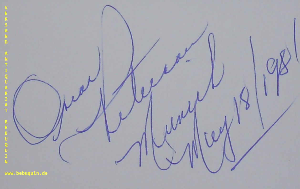JAZZ.– PETERSON, Oscar (Pianist): eigenhändig signierte und datierte Autogrammkarte. München, 18.5.1981. 8 x 12,5 cm. Karteikarte. Oscar Emmanuel Peterson (* 15. August 1925 in Montréal; † 23. Dezember 2007 in Mississauga) war ein kanadischer Jazz-Pianist und -Komponist. Duke Ellington nannte ihn den „Maharaja der Tasten“. Er veröffentlichte über 200 Aufnahmen, gewann sieben Grammys und zahlreiche weitere Auszeichnungen in seiner Karriere. Er wird als einer der erfolgreichsten Jazz-Pianisten aller Zeiten angesehen, der in seiner 65-jährigen Karriere auf Tausenden Konzerten spielte. (Wikipedia)
