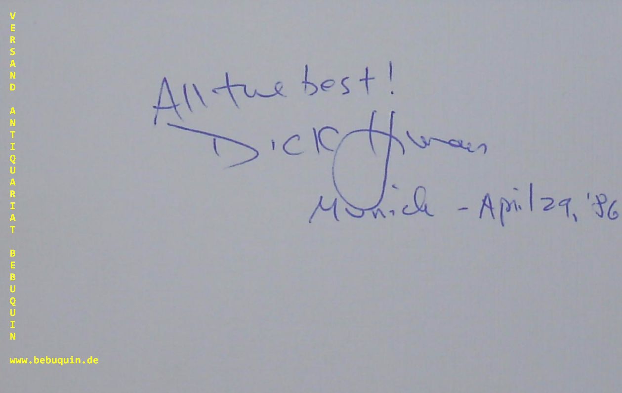 JAZZ.– HYMAN, Dick (Pianist): eigenhändig signierte und datierte Autogrammkarte mit dem eigenhändigen Gruß „All the best!“ München (Philharmonie), 29.4.1986. 8 x 12,5 cm. Karteikarte. Richard Roven „Dick“ Hyman (* 8. März 1927 in New York City, New York) ist ein US-amerikanischer Jazz-Pianist und Arrangeur. (Wikipedia)