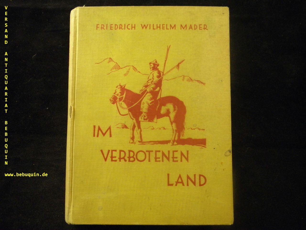 MADER, Friedrich Wilhelm: Im verbotenen Land. Kapitän Münchhausens Abenteuer auf einer Reise durch Tibet. 2. Auflage. Stuttgart (Union), (1931). 263 (1) S. mit 8 Tondruckbildern von W. Chomton. ill. OLn. Einband etwas angeschmutzt, Titel leicht stockig, NaV. seltene Ausgabe. Kotz 4337/28; Bloch 2025.