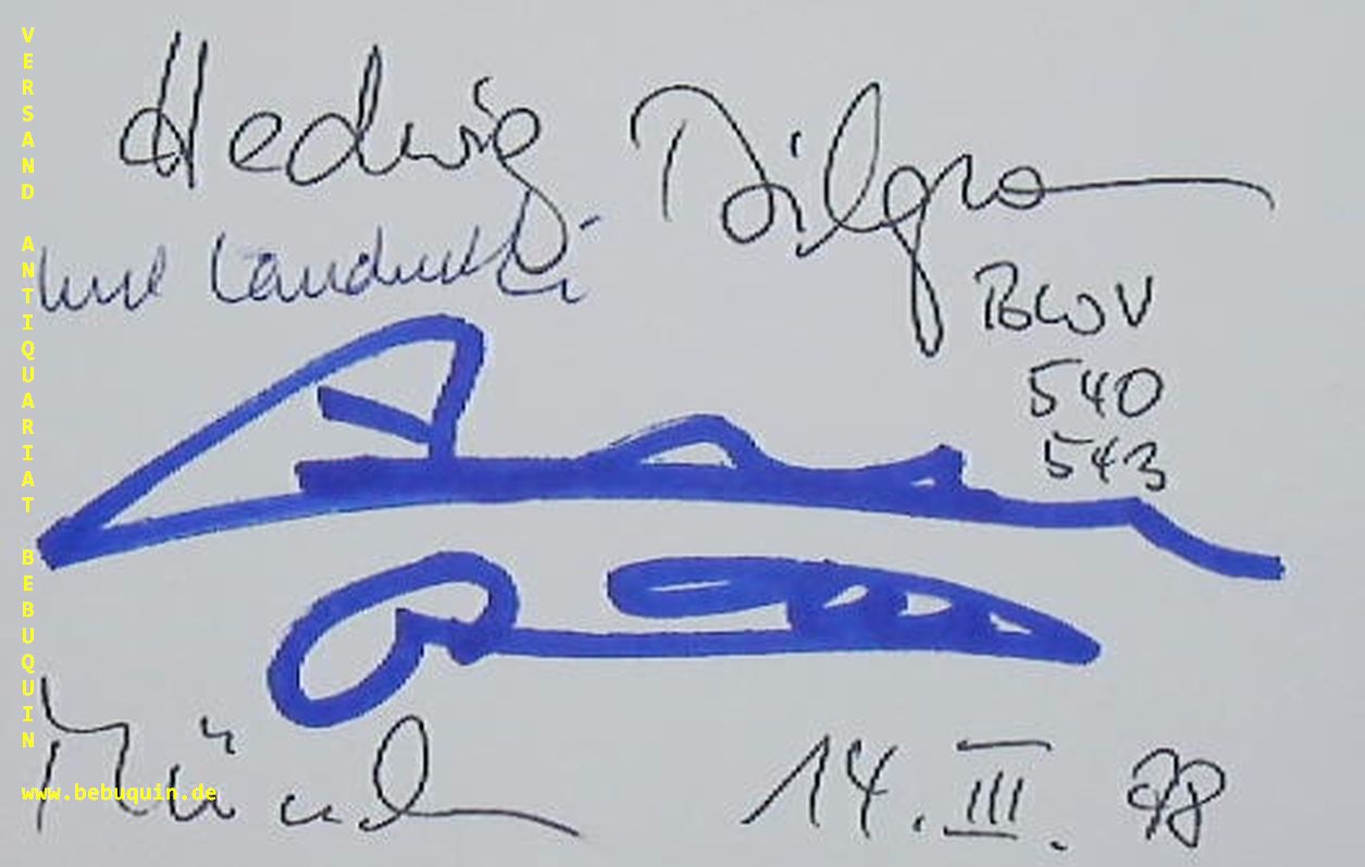 BILGRAM, Hedwig (Organistin) + ANDRE, Maurice (Trompeter): eigenhändig von beiden signierte Autogrammkarte. München (Philharmonie), 14.3.1978. 8 x 12,5 cm. Kartenkarten. Hedwig Bilgram (* 31. März 1933 in Memmingen) ist eine deutsche Organistin und Cembalistin. Sie war an der Hochschule für Musik und Theater München Professorin für Orgel und Cembalo. (Wikipedia)