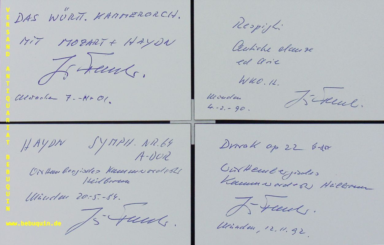 FAERBER, Jörg (Dirigent): 9 eigenhändig signierte und datierte Autogrammkarte mit zahlreichen eigenhändigen Programmbeschreibungen. München (Herkulessaal), 1976 – 2001. 8 x 12,5 cm. 9 Karteikarte. Jörg Faerber (* 18. Juni 1929 in Stuttgart) ist ein deutscher Dirigent und langjähriger Geschäftsführer des Württembergischen Kammerorchesters Heilbronn. (Wikipedia)