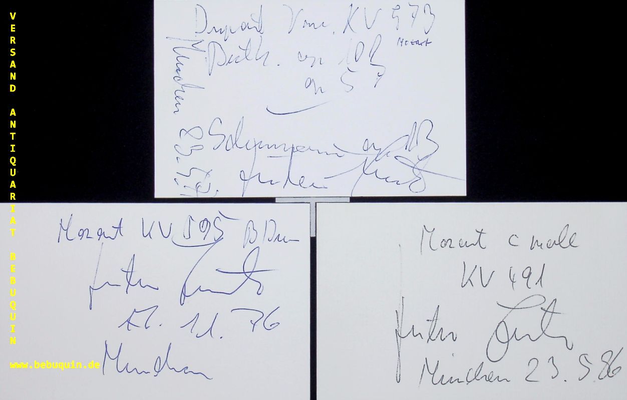 FRANTZ, Justus (Pianist): 3 eigenhändig signierte und datierte Autogrammkarten. München (Philharmonie), 1976 – 1986. 8 x 12,5 cm. 3 Karteikarten. Justus Frantz (* 18. Mai 1944 in Hohensalza, heute Inowroclaw) ist ein deutscher Pianist, Dirigent und Fernsehmoderator. (Wikipedia)