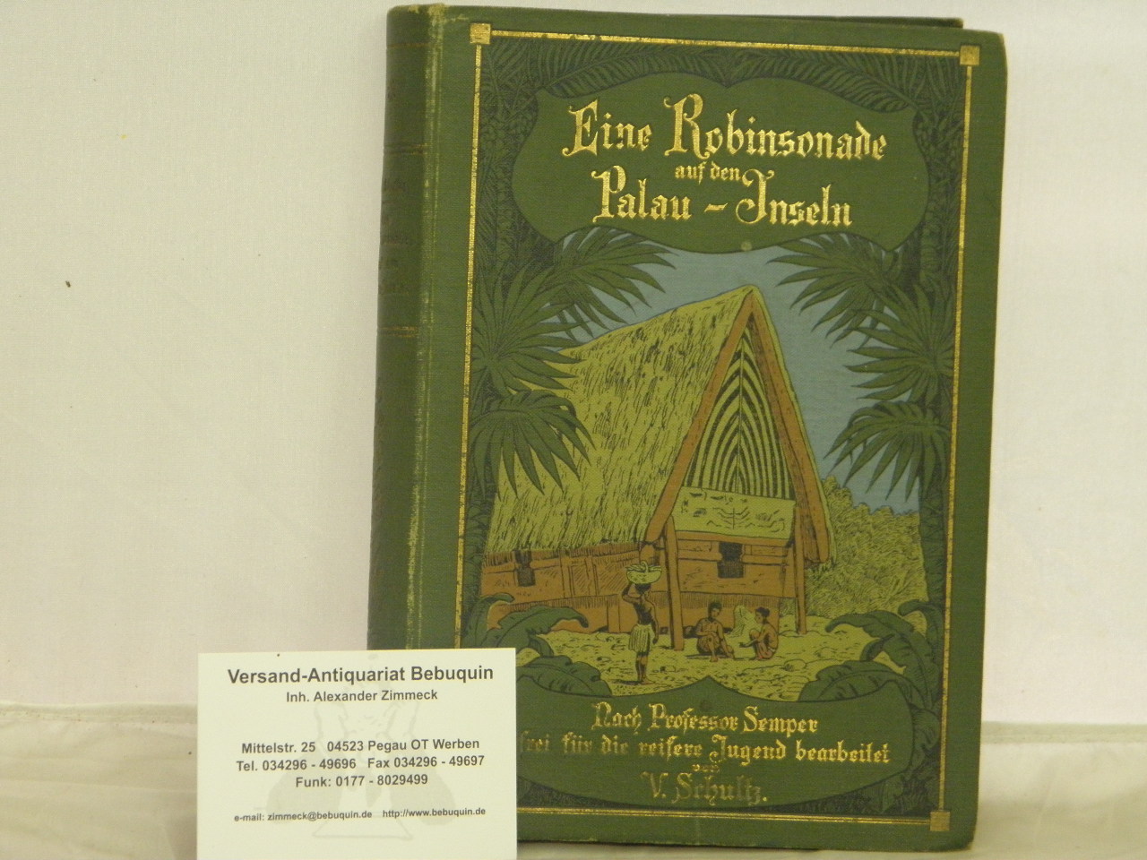 SCHULTZ, V.: (d.i. Veronika Luche) Eine Robinsonade auf den Palauinseln. Nach Prof. Semper frei für die reifere Jugend bearb. Reulingen (Enmßlin & Laiblin), (1905). 220 (4) S. mit zahlr. Bildern von Rudolf Trache. farb. ill. OLn. WaV, schönes Ex. EA. Klotz 6626/3.