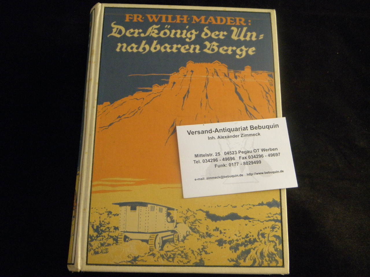 MADER, Friedrich Wilhelm: Der König der Unnahbaren Berge. Wunderbare Abenteuer auf einer kühnen Automobilfahrt ins innerste Australien. 3. Aufl. Stuttgart (Weise), (1924). VIII, 316 S. mit 8 Tondruckbildern und 12 Textabb. von Willy Planck sowie 2 Karten. farb. ill. OLn. feines Ex. Klotz 4337/24; Bloch 2020.