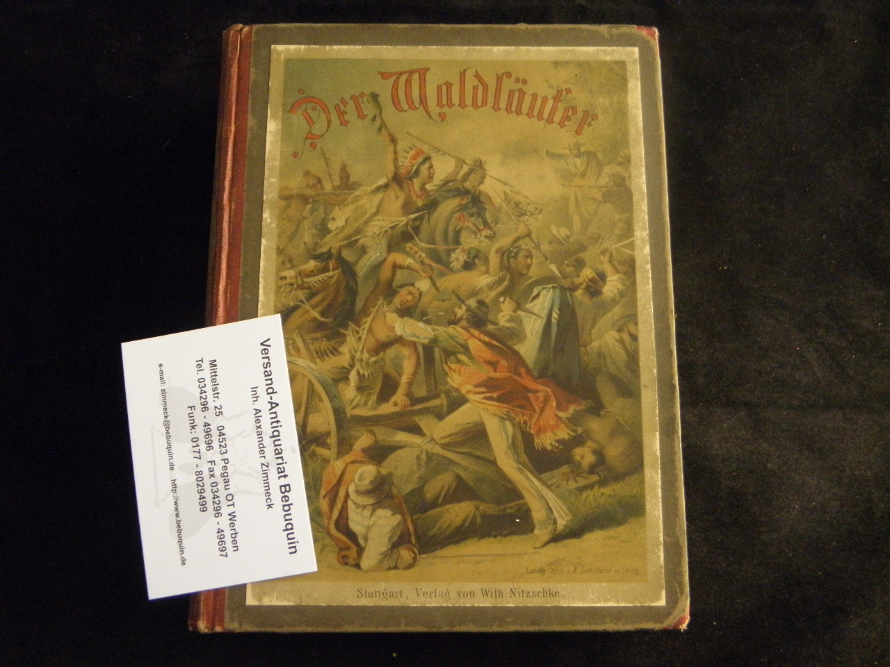 FERRY, Gabriel: Der Waldläufer. Bearb. von Oskar Höcker. Stuttgart (Nitzschke), (1877). Gr. 8°. V, 233 S. + 6 Farbendruckbilder von G. Bartsch. farb. ill. OHLn. etwas gebräunt, gutes Ex. EA. Klotz 1451/41.