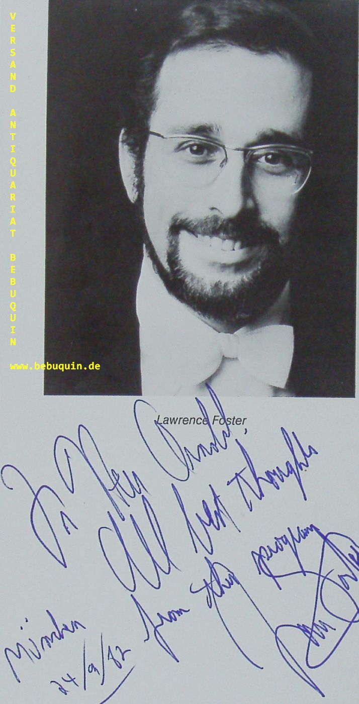 FOSTER, Lawrence (Dirigent): eigenhändig signiertes und mit einer 5zeiligen datierten Widmung versehenes Portrait aus Programmheft. München, 24.9.1982. 18 x 9,5 cm. 2 Blatt. Lawrence Foster (* 23. Oktober 1941 in Los Angeles) ist ein US-amerikanischer Dirigent. Seit 2013 ist er Leiter der Opéra de Marseille, seit 2019 auch Chefdirigent beim Nationalen Symphonieorchester des Polnischen Rundfunks. (Wikipedia)