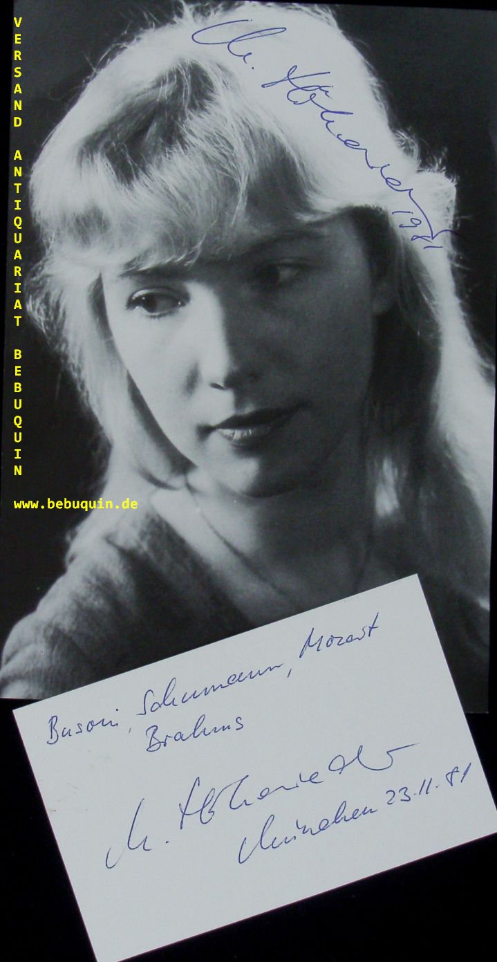 HÖHENRIEDER, Margarita (Pianistin): eigenhändig signiertes und datiertes schönes Portrait aus Programmheft. München (Kongresssaal), 24.11.1982. 16 x 8 cm. 1 Bl. + eine ebenfalls eigenhändig signierte und datierte Karteikarte. Margarita Höhenrieder (* 1956 in München) ist eine deutsche Pianistin und Professorin an der Hochschule für Musik und Theater München. (Wikipedia)