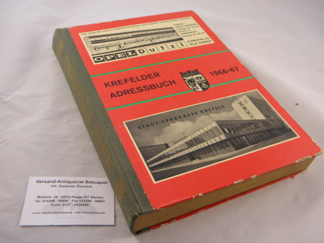 KREFELD.– KREFELDER ADRESBUCH 1966/67.– Aachen (Wendler), 1966. Gr. 4°. 12 Bl., 309, 270, 32, 16, 62 S. und einer farb. Stadtkarte im Anhang. ill. OHLn. gutes Ex. Mit der Sortierung nach Einwohner, Straßen, Branchen und Behörden.