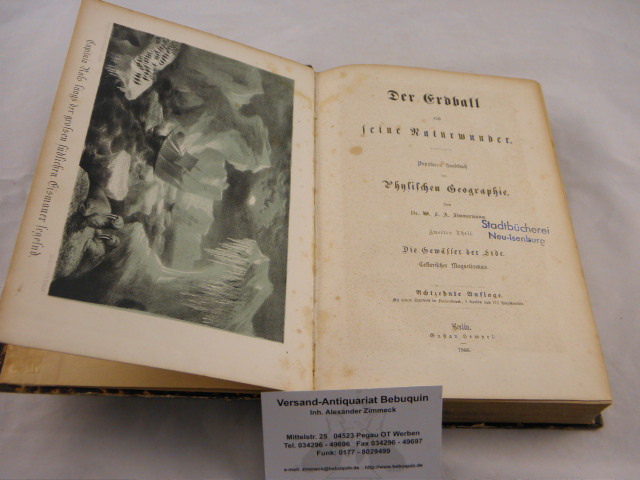 GEOLOGIE.– ZIMMERMANN, W.F.A.: Die Gewässer der Erde. Cellurischer Magnetismus. 18. Aufl. Berlin (Hempel), 1866. VI, 542 S. mit 1 Titelbild in Farbendruck, 5 Karten und 125 Holzschnitten. HLdr der Zeit mit goldgeprägtem Rücken. StaV, StaT, insgesamt gutes Ex. = Der Erdball und seine Naturwunder. Zweiter Teil.