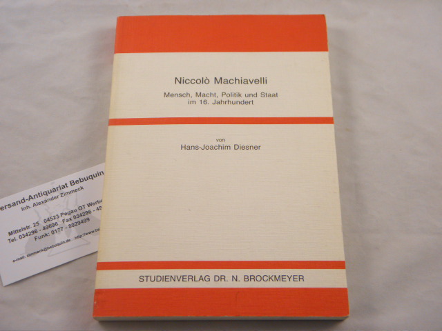 MACHIAVELLI.– DIESNER, Hans-Joachim: Noiccolo Machiavelli. Mensch, Macht, Politik und Staat im 16. Jahrhundert. Bochum (Brockmeyer), 1988. 200 S. OKart. wie neu. EA mit einer eigenhändigen Verfasserwidmung an E. Mauersburger auf Titelseite.