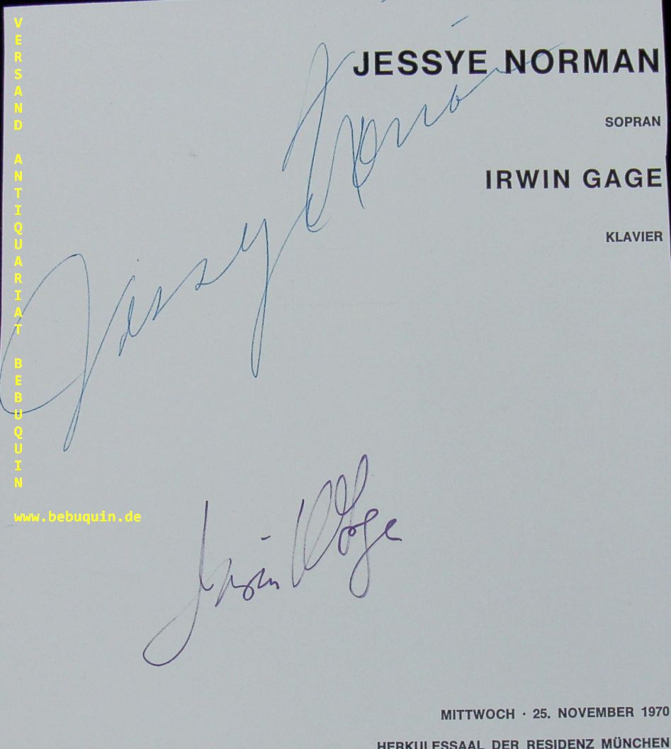 NORMAN, Jesye (Sopran) + GAGE, Irwin (Pianist): eigenhändig von beiden signierter Programmausschnitt. München, 25.11.1970. 18 x 16 cm. 2 Bl. Jessye Norman (* 15. September 1945 in Augusta (Georgia); † 30. September 2019 in New York City) war eine US-amerikanische Opernsängerin (Sopran). In ihrem Repertoire bildeten unter anderem Opern und Lieder der Romantik einen Schwerpunkt, sie ist aber auch als Interpretin von Spirituals und Jazz hervorgetreten und wurde mit fünf Grammys ausgezeichnet. Irwin Gage (* 4. September 1939 in Cleveland, Ohio; † 12. April 2018 in Zürich) war ein amerikanischer Pianist und Liedbegleiter. (Wikipedia)