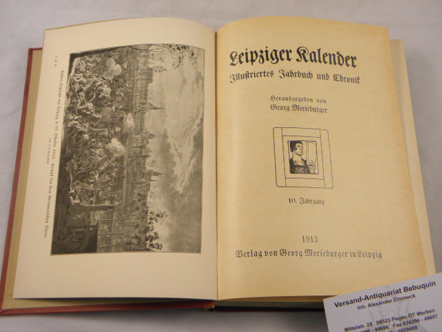 LEIPZIG.– MERSEBURGER, Georg: (Hrsg.) Leipziger Kalender. 10. Jg. Illustriertes Jahrbuch und Chronik. Leipzig (Merseburger), 1913. 316, 102 S. mit zahlr. Abb. + teils gefalteten Bildtafeln. ill. OLn. gut erhalten. EA.