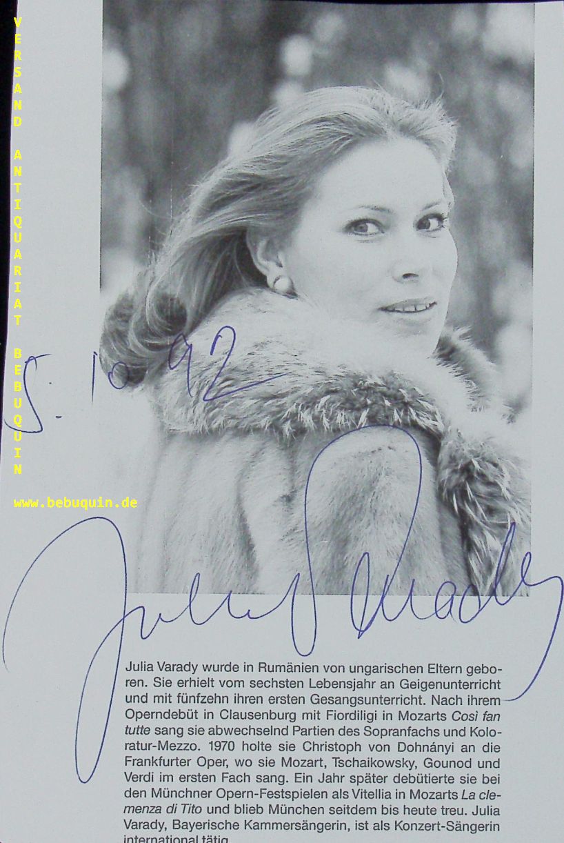 VARADY, Julia (Sopran): eigenhändig signiertes Portrait. München (Herkulessaal), 5.10.1992. 20 x 14 cm. 1 Bl. Julia Varady (* 1. September 1941 in Oradea als Tozsér Júlia) ist eine ungarisch-deutsche Opern- und Konzertsängerin. (Wikipedia)